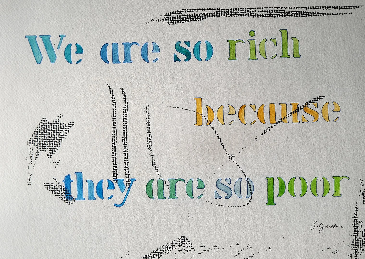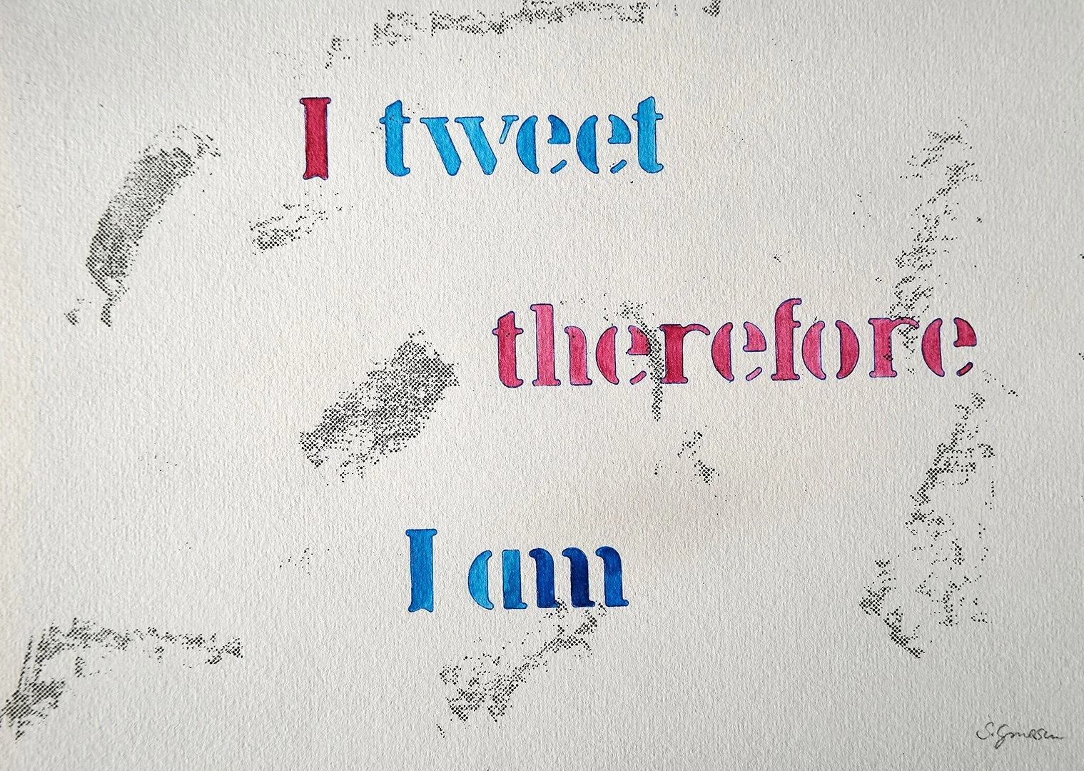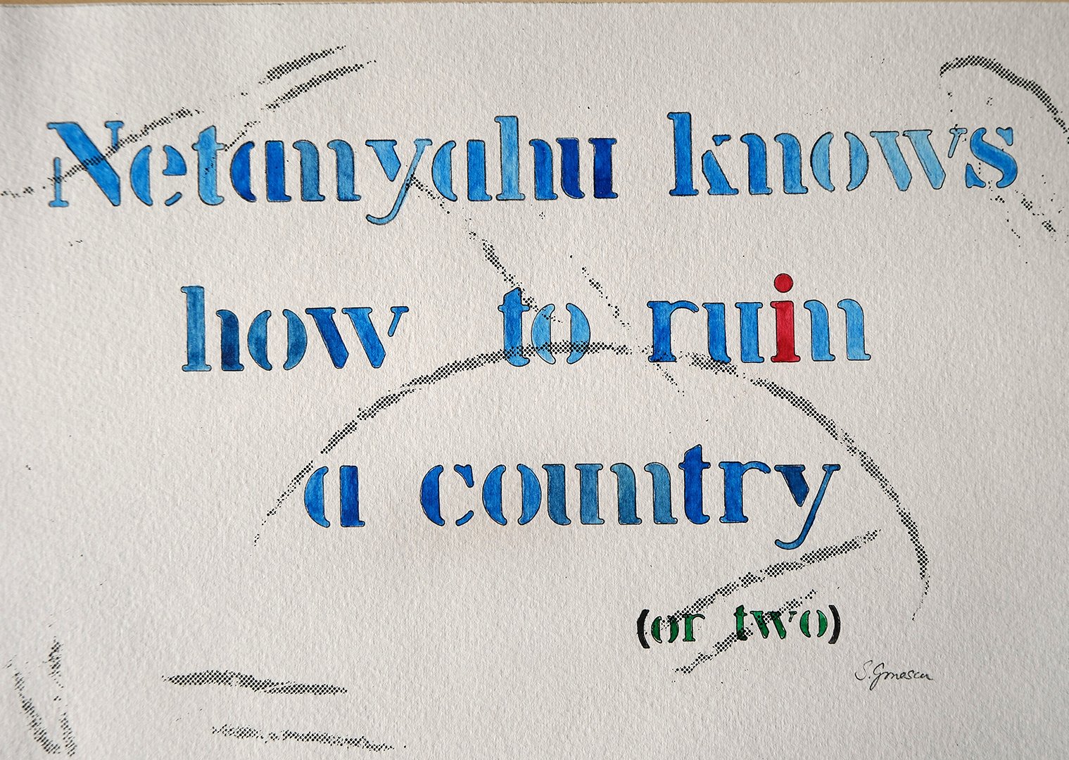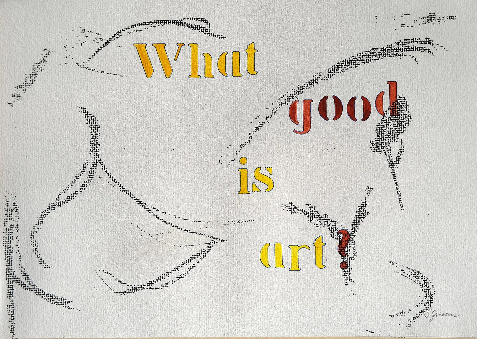 My artwork often expresses a feeling, a thought, or a political viewpoint. In its simplest form one can see those in my “What am I thinking?” series. These are done with stencils and watercolour on paper.